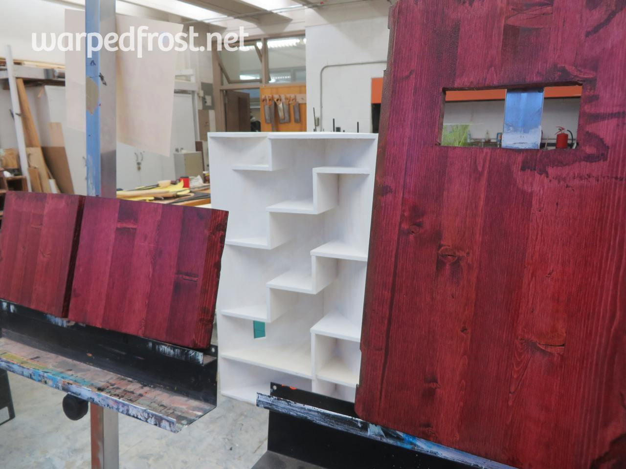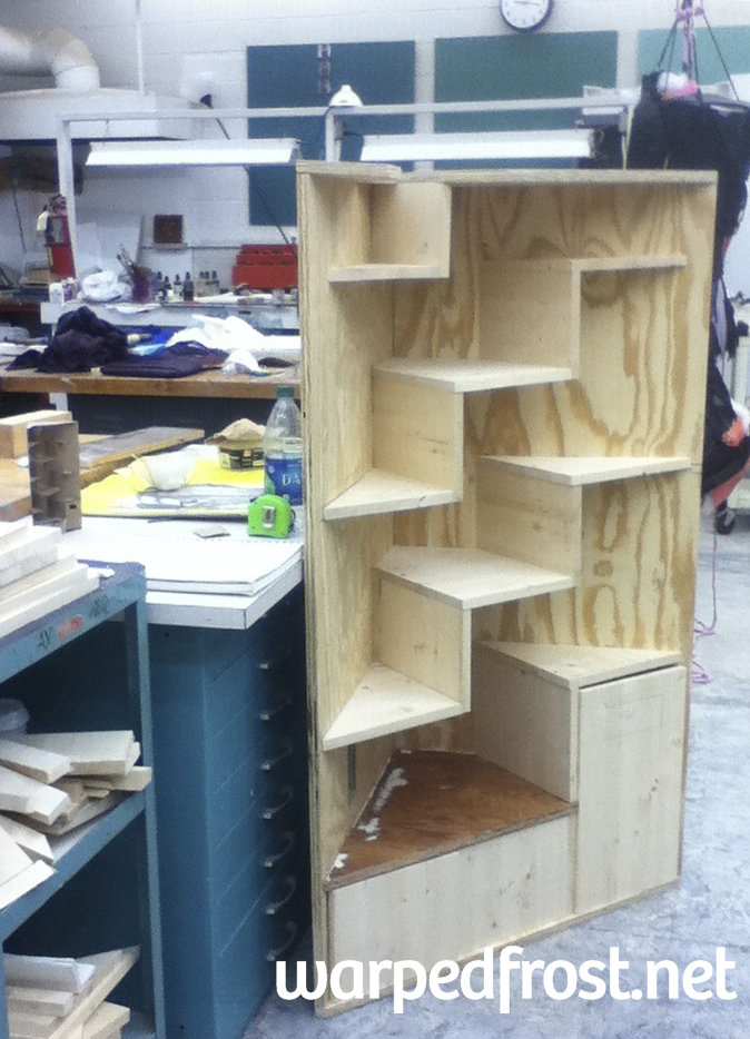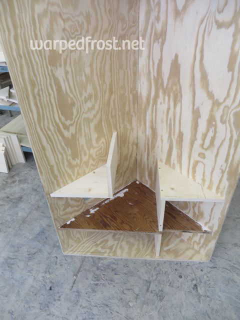 At this point, the biggest technical challenge was cutting the large triangles. The miter gauges in both the Art Education wood shop and the Fine Arts wood shop weren’t big enough, I think. The base and uppermost triangles were cut by the Safety Monitor by clamping the wood down to a table and cutting with a saber saw. The shelf triangle I did myself using the same technique, though my hand was not as steady as his.