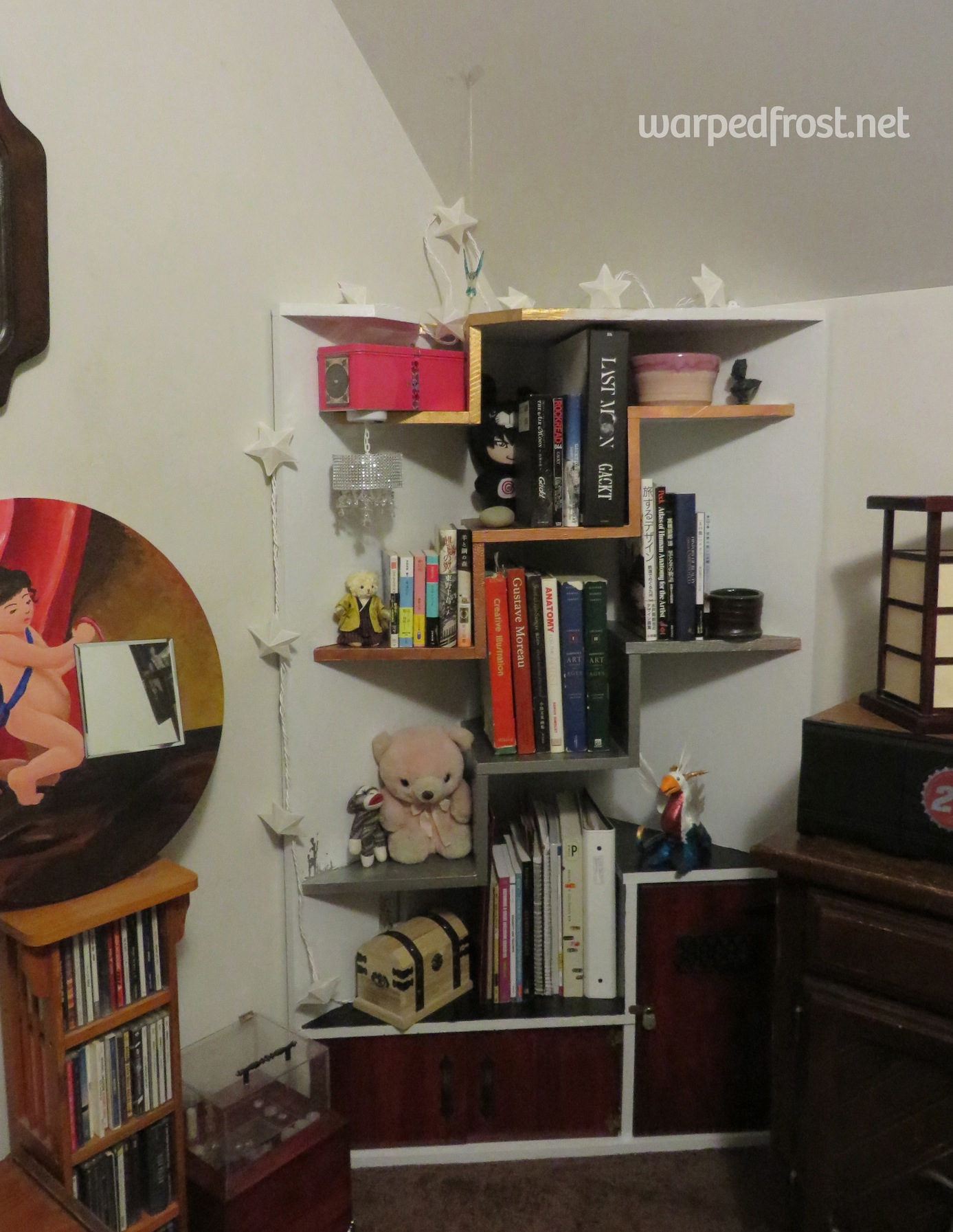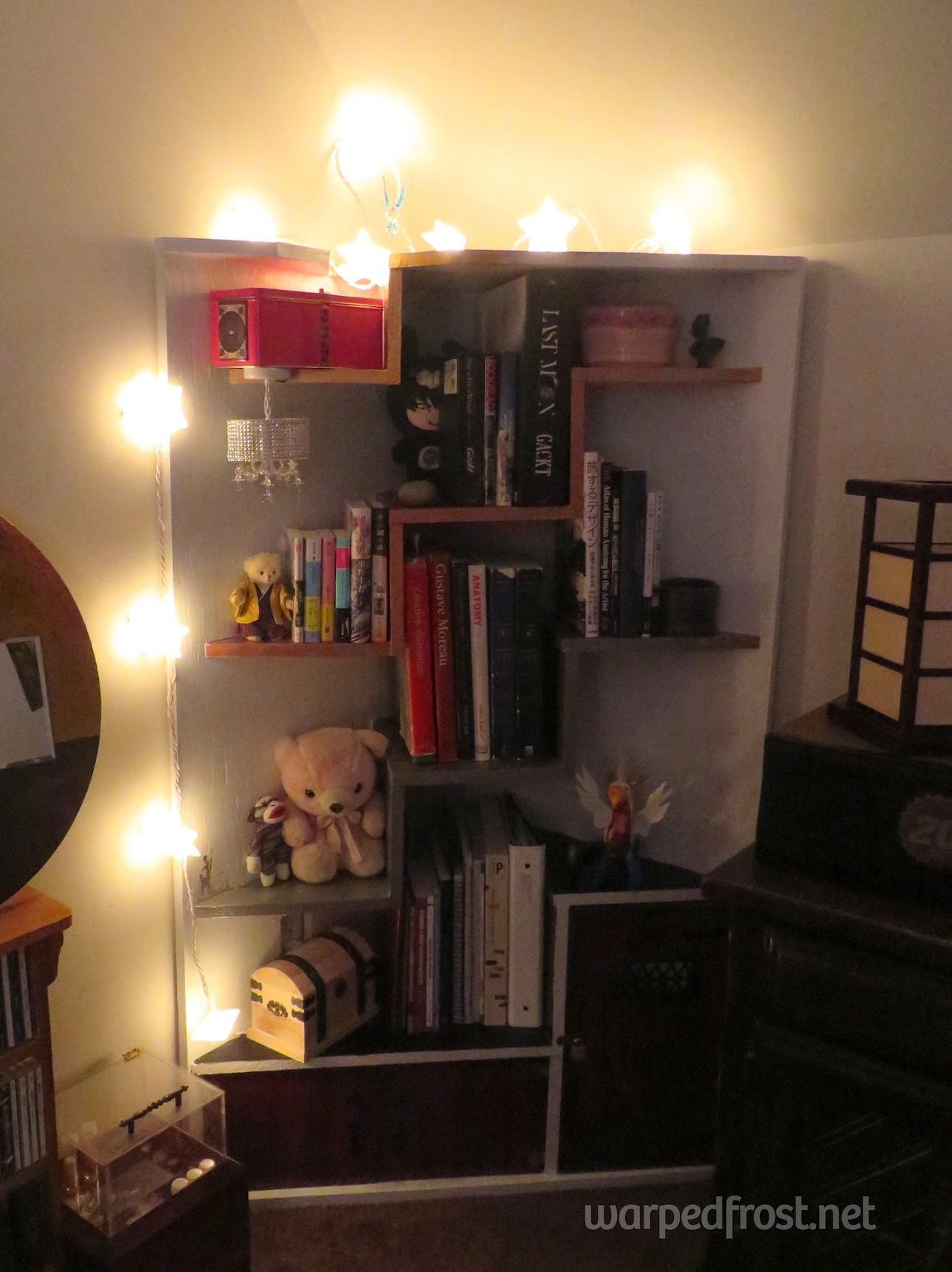 Originally I had wanted the bookshelf to go all the way to the ceiling, meaning I would have had to make a compartment that was a triangle on the bottom and a shape I couldn’t wrap my mind around thanks to the sloping walls of the “attic” ceiling above. So that got nixed. Instead I put star-shaped lights around it. Which makes this look even more juvenile than the googly-eyed chimera made it look, but…meh, it makes me laugh.