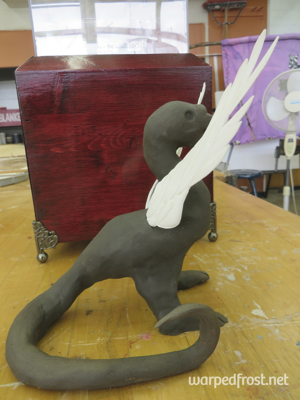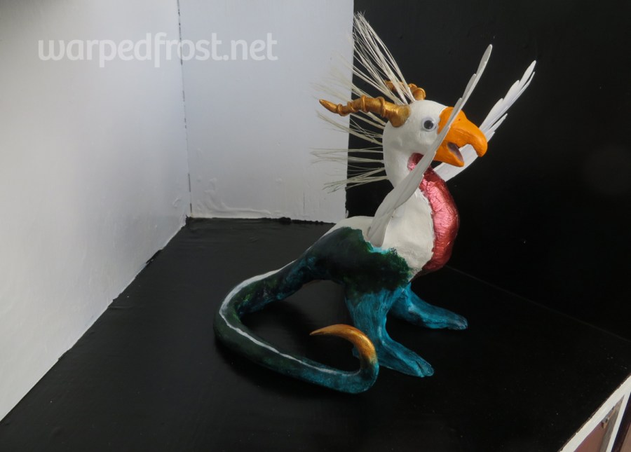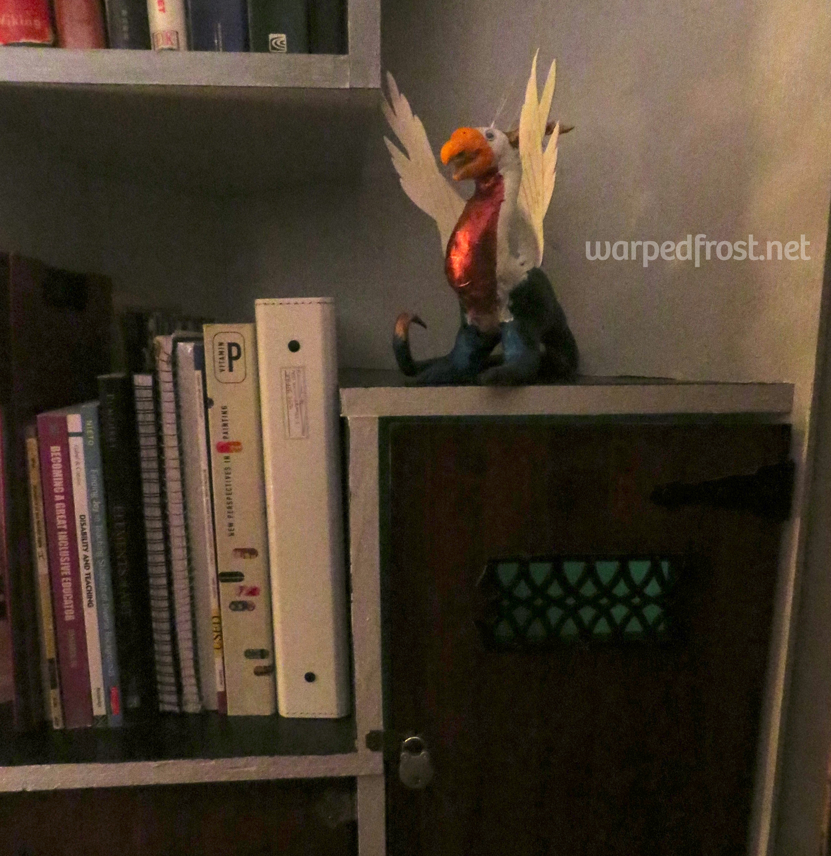 I also made a little chimera out of clay to be locked up inside the “Chimera Closet” (the tall compartment on the bottom) but…once you put googly eyes on something, it’s too cute to keep it locked up. It was hardly visible through the grate in the door anyway, so it wouldn’t have had the desired effect. I needed to have made it smaller, but this was my first time in probably more than a decade working in clay so I couldn’t handle it skillfully. The main inspiration for it was the basilisk.