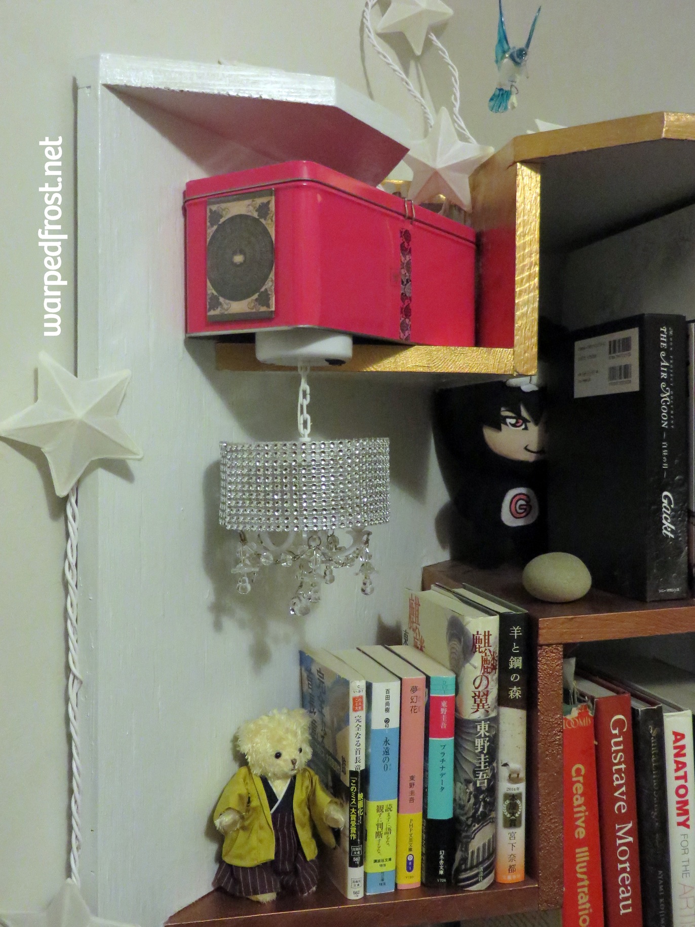 One thing I hadn’t considered as I was building this was that the side risers would only be able to hold very small books, as there aren’t many books that are 12 inches high but only 4 inches wide. This means the center risers end up looking very heavy while the side ones are nearly empty. The little corner above avoids that imbalance by having the chandelier hanging down from the riser above (each “flight” is shallower than the one below it, which is why the pink metal locker can stick out from the highest riser while still being inside the casing). I’ll have to try similar things on the other outer risers to achieve a more balanced look.