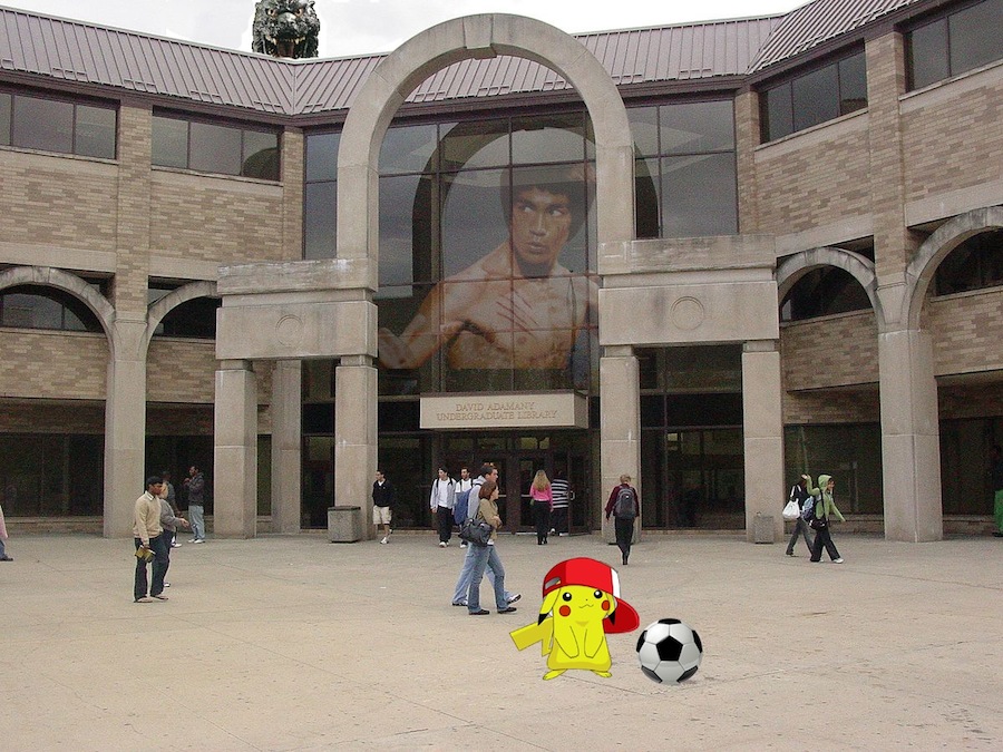 Can you describe where Pikachu, Bruce Lee, and the soccer ball are relative to each other, O Readers? ^o^