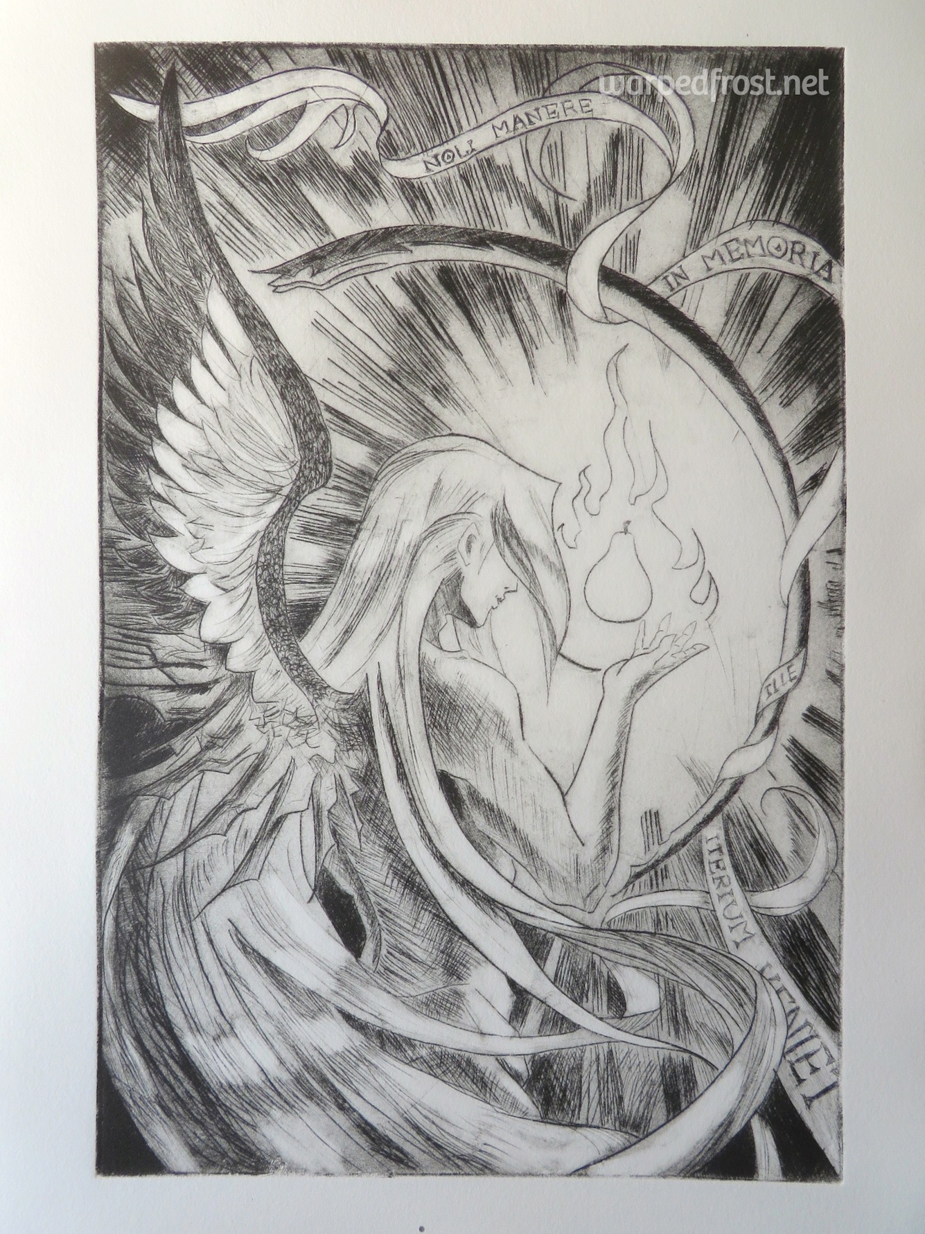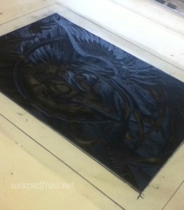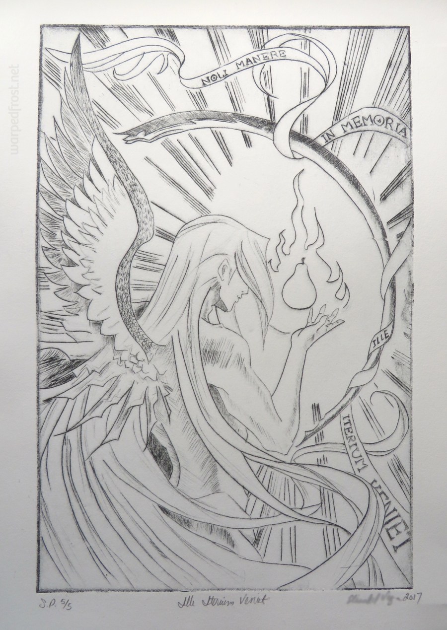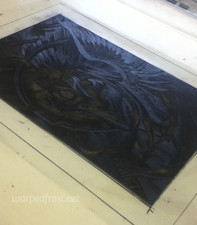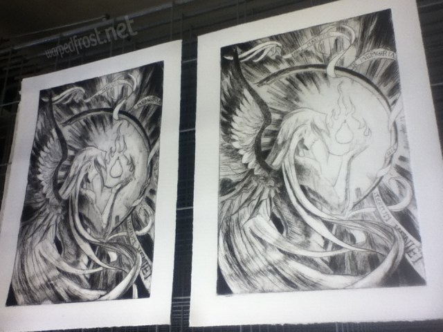 I’m still technically not done with this, because there are stray scratches visible in the two best prints I pulled. I contacted my teacher for advice, asking whether I should just ink the light prints by hand with a pen, or try to erase the stray marks off the page from the better prints. She said it wouldn’t really be a print anymore if I did too much with pen, but that it could be considered a mixed media piece. I’m thinking of going the eraser route.