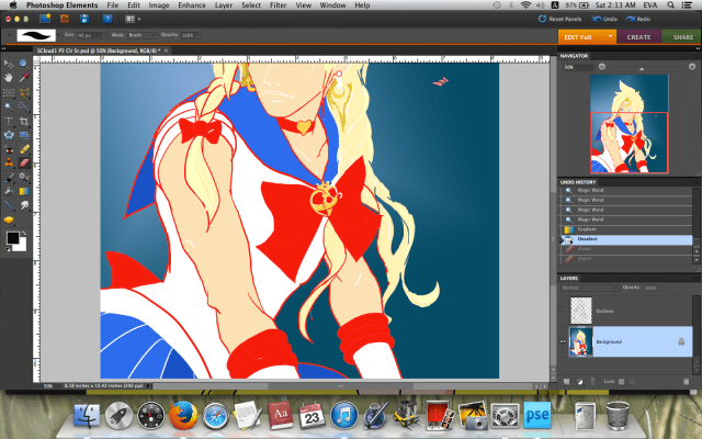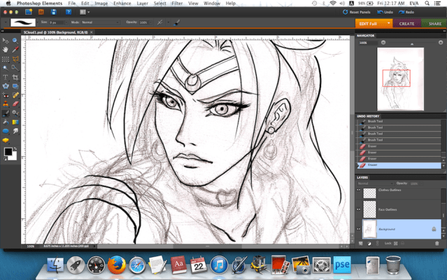 So I scanned my drawing with my printer/scanner/copier and iMac (both from 2007), transferred the file to my 2013 MacBook Pro, and used my Wacom Intuos 3 tablet (2008) with Photoshop Elements 8 (2009). I refuse to buy a new printer or tablet until the old ones break! Because e-waste is too big of a problem for the environment! And I grew up with Captain Planet!