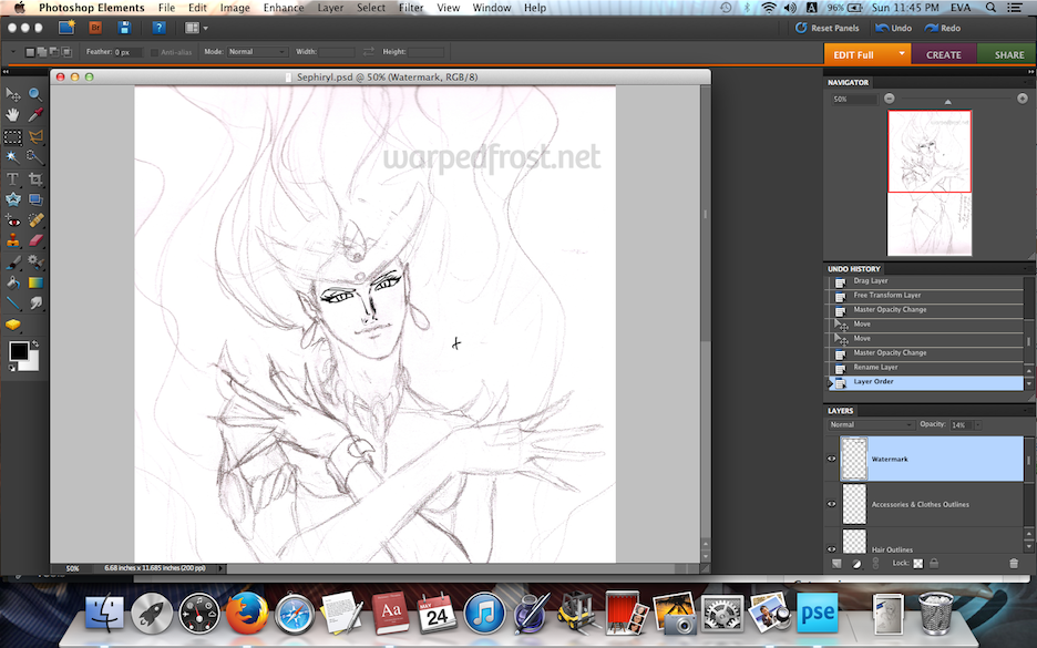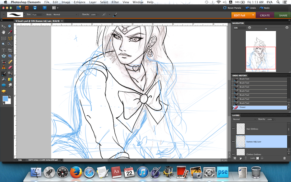 So I scanned my drawing with my printer/scanner/copier and iMac (both from 2007), transferred the file to my 2013 MacBook Pro, and used my Wacom Intuos 3 tablet (2008) with Photoshop Elements 8 (2009). I refuse to buy a new printer or tablet until the old ones break! Because e-waste is too big of a problem for the environment! And I grew up with Captain Planet!