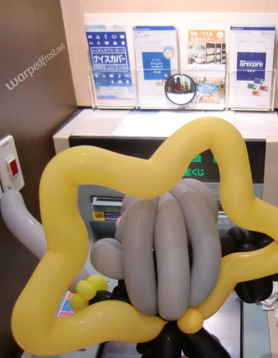 Balloon Seph seen from behind as he studies a Fukuoka Bank ATM