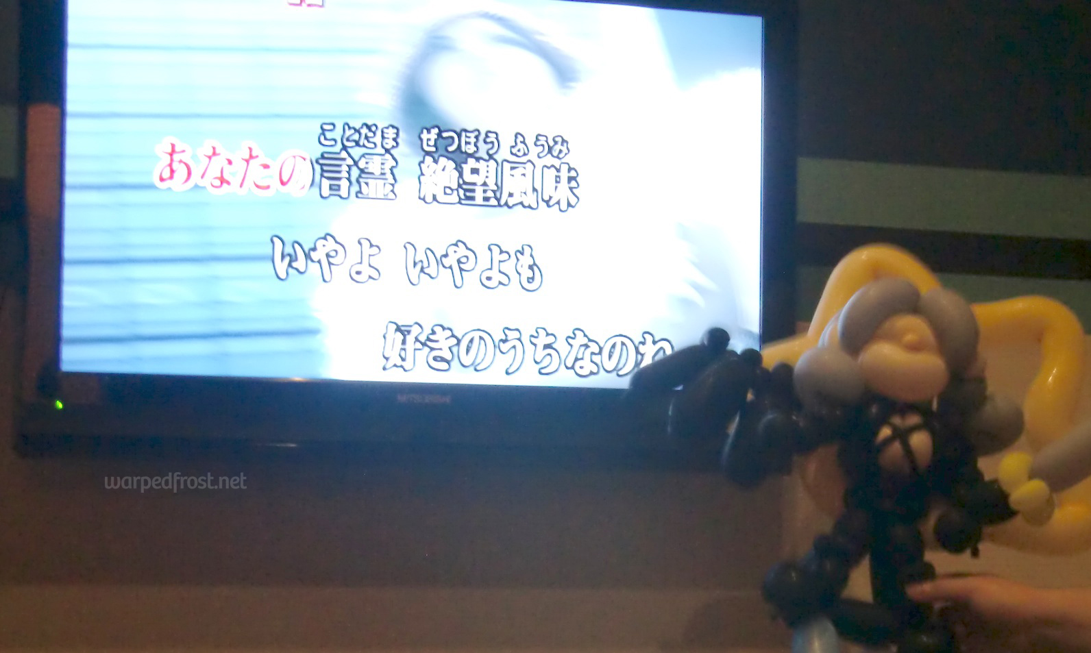 Balloon Seph in front of a TV screen in the karaoke room with the lyrics to "Zessei Bijin" from the anime "Sayonara Zetsubou Sensei," which includes the word "despair" (zetsubou) in the lyrics.