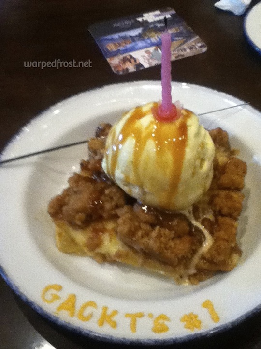 Apple cobbler with ice cream on top and a candle, with the message "Gackt's #1" written in frosting on the lip of the bowl.