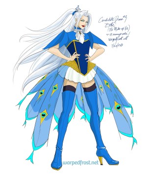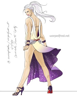 I struggled with this one the most. I don’t even remember the order of my train of thought, but some points it hit where “bird of paradise (the flower),” “birds,” “Björk’s swan dress but with a chocobo instead,” “Athena in armor,” “exotic dancing,” and “belly dancing.” I initially decided to go with a dance theme again, and watched lots of dancing videos, made several rough croquis, and then, for whatever reason, decided the thing to do was exotic birds after all.