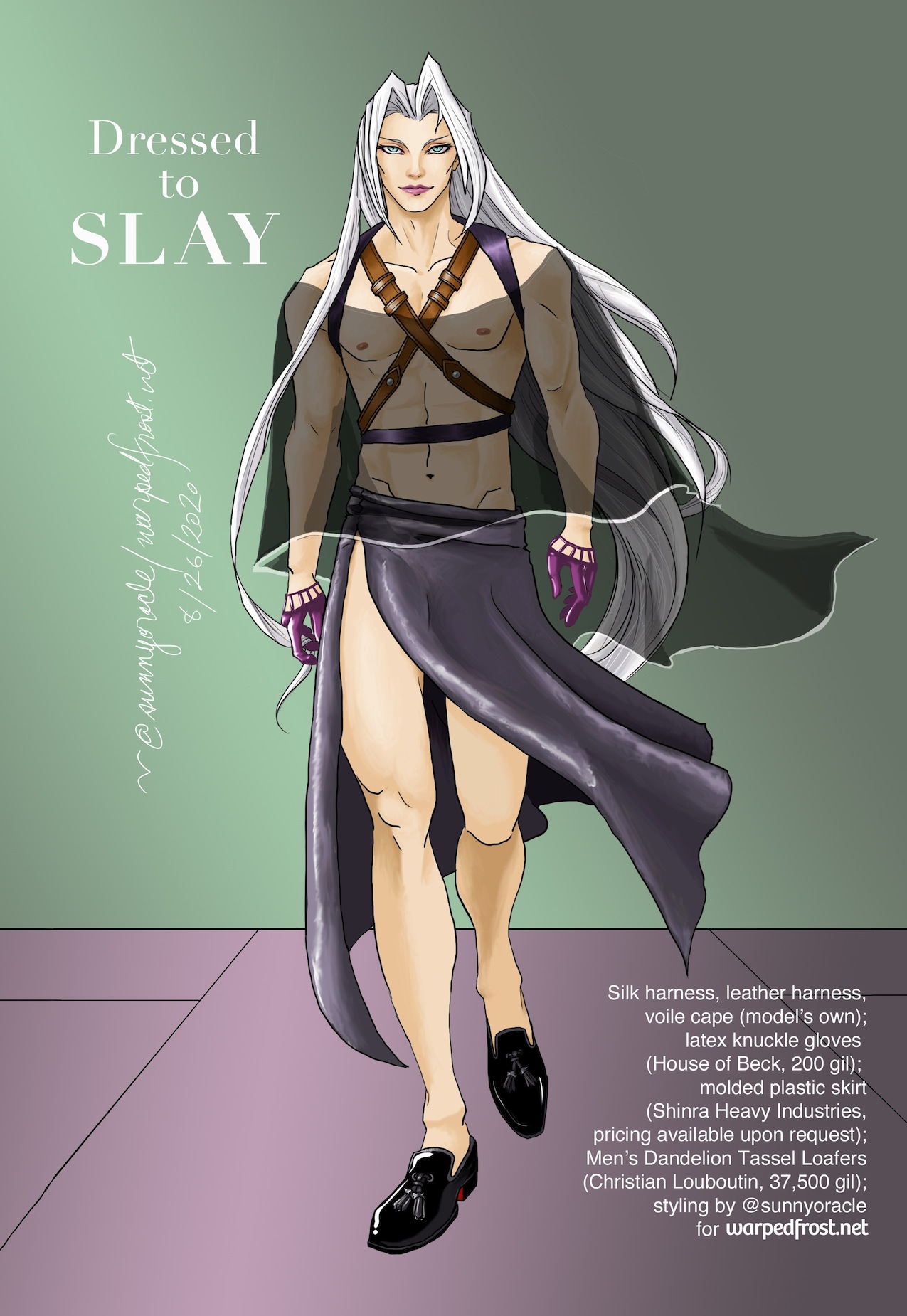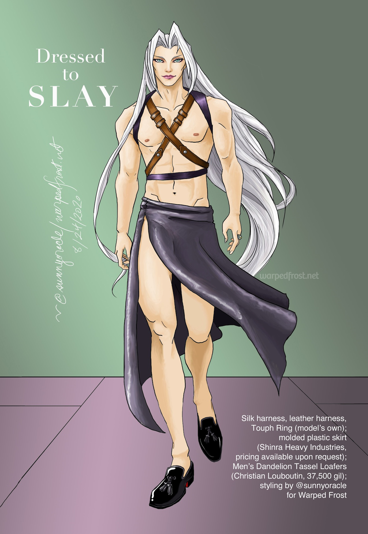 I also had a leftover desire to make his harness the main focus of an outfit; it was something I felt I couldn’t incorporate believably into the bridal candidate dress designs I’d done earlier this summer.