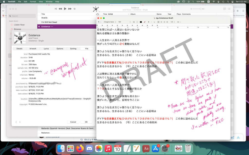 Now, I had stopped posting lyrics in Japanese because I don’t have permission to do so. In this case, as what I’m hearing the lyrics as is what I’m going off of for the translation, I think it’s fair to post them. The only thing I could do however was post it as an image so I could slap the word “draft” over them. This way if someone takes the image, the fact that it’s a draft will still be clear unless they give themselves the work of removing that watermark. So here’s a screenshot of the lyrics as I wrote them while listening to the song. This is what “kikitori” means by the way. “Kikitori” literally means “hear – catch” which is a nice convenient word, as opposed to having to say “heard lyrics” which is a bit awkward or “what I hear” which is a bit long to put into a post title.