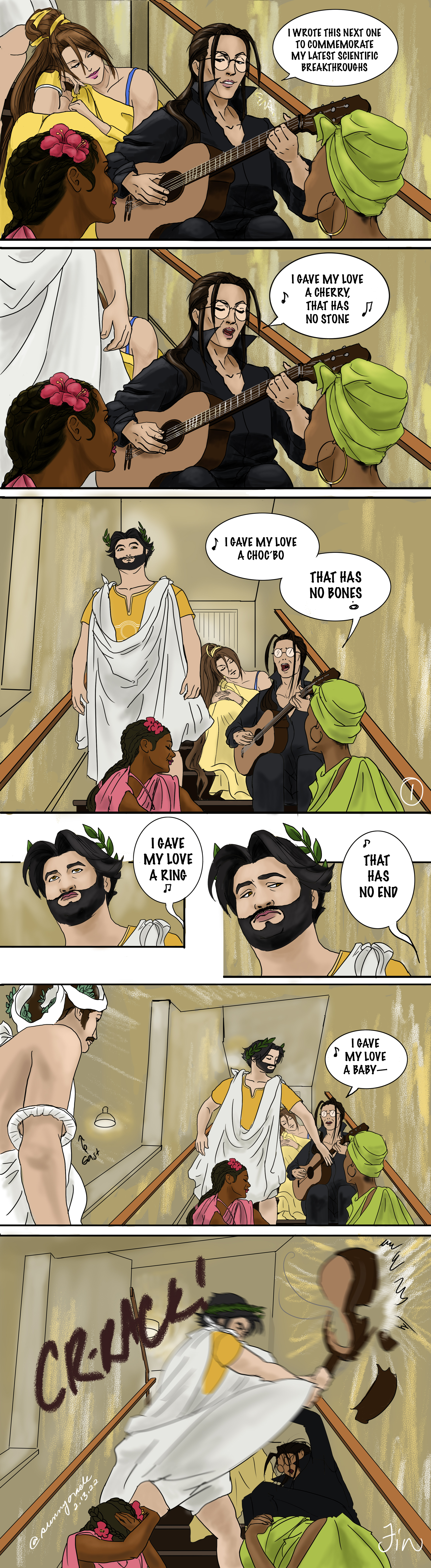(Zoom out on the group sitting on the stairs. The newcomer is revealed to be Hollander, with a toga made from sheets over his Banora t-shirt and a crown of laurel leaves on his head. Hojo is belting it out while the women listen with eyes closed, smiling.)
